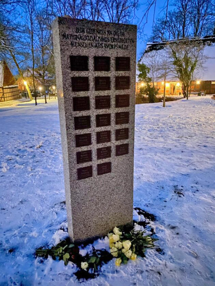 • Lesung aller zur Zeit bekannten Opfernamen u.a. durch Mitglieder der Arbeitsgruppe „Aufarbeitung der NS-Zeit in Worpswede“ und der Initiative „Nie wieder – Erinnern für die Zukunft – Gemeinsam gegen Rechts“ und Niederlegung einer Rose für jedes Opfer am Gedenkstein.